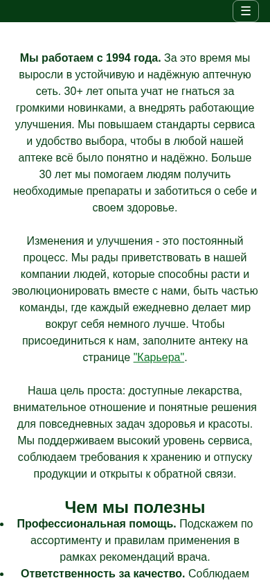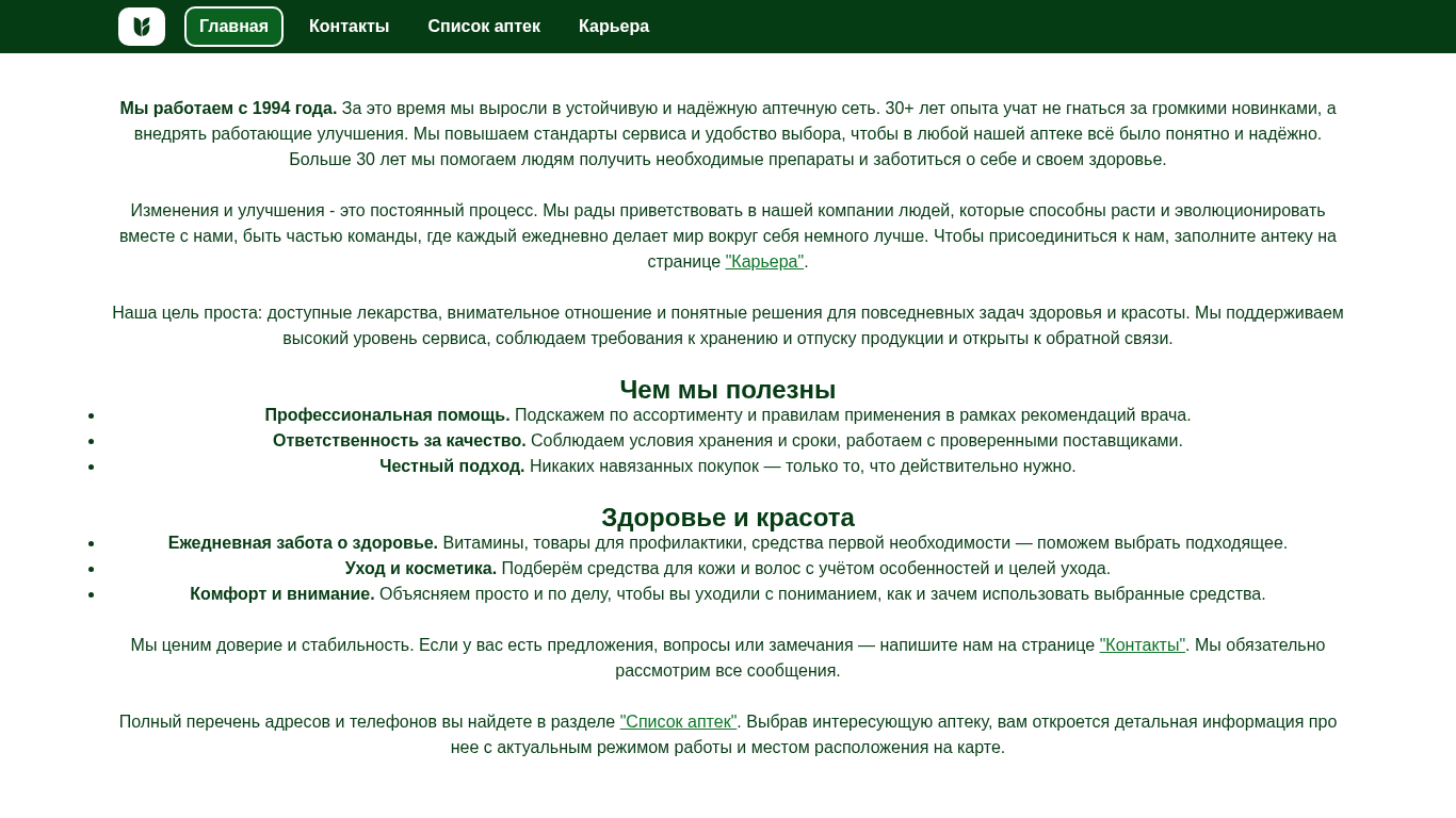 | AI-анализ | This website is for the Belarusian pharmacy chain "Юнифарм" (Unipharm). It provides information about the company, its history, and the services it offers. The website emphasizes the company's long-term commitment to providing reliable and accessible healthcare solutions. With over 30 years of experience, Unipharm aims to maintain a high level of service, adhere to quality standards, and offer a clear and understandable approach to healthcare and beauty products. The website includes a career section, a list of contacts and addresses for various Unipharm locations, and a section dedicated to customer service. The company prides itself on its professional approach, responsible handling of products, and honest business practices. Unipharm offers a wide range of pharmaceuticals, vitamins, and cosmetics, with a focus on customer understanding and ease of selection. The website is available at unipharm.by |