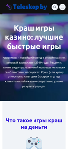 | AI-анализ | --- The website teleskop-by.org provides information about the best crash games in Belarusian .BY online casinos for 2023. It covers topics on how to play fast games with strategies and available bonuses for crash games. Crash games, also known as crash or crash games, are a new trend in online casinos that emerged in 2019. These games require minimal skills, as they do not involve traditional symbols or combinations. Instead, players make stakes while the coefficient is increasing or guess the limit of the multiplier. Visual representations of this process can be various, such as a rocket launch, jet takeoff, or the movement of cryptocurrency graphs. Each round lasts from a few seconds to a few minutes and can involve tens or hundreds of participants. Predicting when the round ends is impossible due to random number generation. The coefficient increases from |