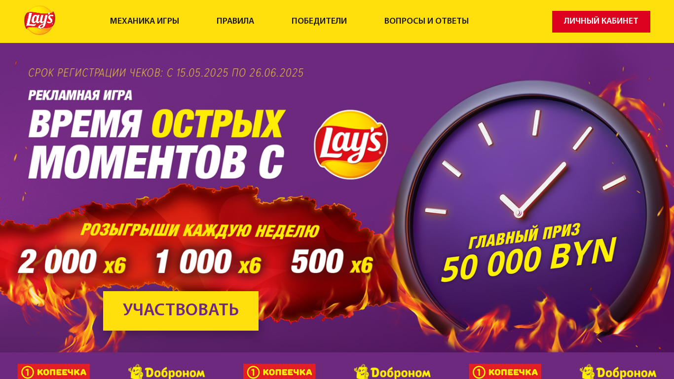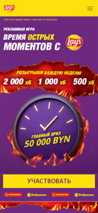 | AI-анализ | --- The portal igra.lays.by is a promotional game website for Lay's chip purchases in Belarusian stores Cooper and Dobronom. Users need to buy Lay's chips worth at least 3 BYN and register the receipt on the site within an hour to receive 24 game points. The points accumulate and can be exchanged for game codes for weekly lotteries with prizes of 2000, 1000, 500, and 50,000 BYN. The game is open to all physically present adults in Belarus during the promotion period, which runs from May 15 to June 25, 2025. Participants must provide their personal information, agree to data processing, and upload a clear image of the receipt with the Lay's product name, purchase date and time, store name |