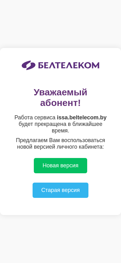 | SEO-лексика | версия белтелеком личный кабинет уважаемый абонент работа сервиса issa beltelecom будет прекращена ближайшее время предлагаем вам воспользоваться новой версией личного |