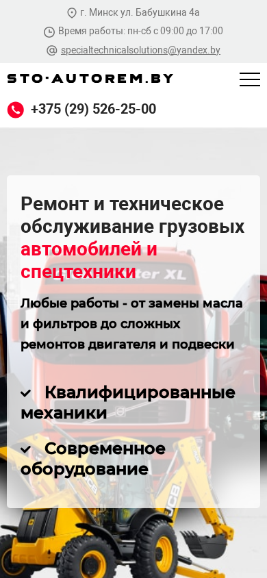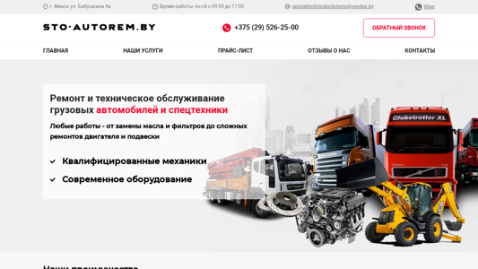 | AI-анализ | This online resource is titled "Sto-autorem" and is a Minsk-based auto-servicing company specializing in the maintenance and repair of heavy-duty vehicles and special equipment. The company's address is Ul. Babushkina 4a. Their working hours are Monday to Saturday from 9:00 to 17:00. They can be reached through specialtechnicalsolutions@yandex.by, Viber STO-AUTOREM.BY, or by calling +375 (29) 526-25-00. The website offers various services, from oil and filter changes to complex engine and suspension repairs. Their team of qualified mechanics utilizes modern equipment, and they guarantee the use of high-quality parts and materials for long-lasting repairs. With a long-standing experience in repairing vehicles of various makes and models, they |
