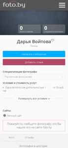 | AI-анализ | This online resource is the website of photographer Daria Voitova from the city of Polotsk in Belarus. The main focus of the site is the presentation of her portfolio in the "Portrait Photography" category. Visitors can view various portrait photographs taken by Daria on the website. She offers her photography services for individual photo sessions in the city of Polotsk. |