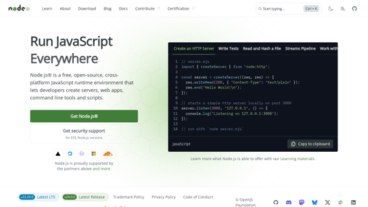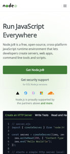 | AI-анализ | The website nodejs.org is dedicated to Node.js, a free, open-source, cross-platform JavaScript runtime environment. Developers can use Node.js to create servers, web applications, command line tools, and scripts. The website provides resources to download Node.js, learn about its features, and contribute to its development. The homepage showcases a simple HTTP server example written in Node.js, and offers links to learn more about its capabilities. The latest versions of Node.js, including LTS (Long Term Support) and Release versions, are available for download. The website also includes policies on trademark, privacy, code of conduct, and security. |