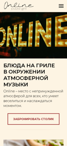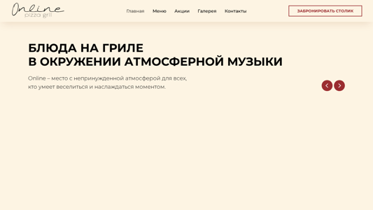 | AI-анализ | This online resource is a website for a modern cafe-bar named "Online" located in the center of Novopolotsk, at Molodezhnaia Ulitsa 153V. The establishment operates daily from 12:00 to 01:00, offering guests a diverse menu that includes dishes from the grill, pizza, salads, desserts, and a special fitness menu for health-conscious diners. The cafe-bar provides a cozy atmosphere, free Wi-Fi, and sports broadcasts. Guests can also place orders for takeout by calling +375 29 810-30-99. Keep updated with news and promotions on the official Instagram page. The website consists of the main content sections: Home, Menu, Special Events, Contact, and Table Reservation. The registration number of the business is 3 |