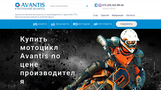 | AI-анализ | The portal Avantis in Belarus - Buy Avantis motorcycle The portal Avantis in Belarus is the official representative of the Avantis motorcycle brand in the Republic of Belarus. It offers the sale of motorcycles, pitbikes, enduros, and motocrosses from Avantis. Test-drives of motorcycles are available. The website provides information on guarantees, PTS, contacts, and a catalog of motorcycles. The top keywords include motorcycle, Avantis, regulmoto, buy, PTS, and Belarus. The website offers a selection of motorcycles and equipment for various needs and budgets. It is an official dealer, allowing for purchases without markups. Delivery is available throughout Belarus, and financing or credit options are also provided. The catalog includes pitbikes and enduros from |