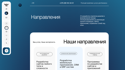 | AI-анализ | --- This online resource is dedicated to mobile application and platform development services. The company employs a phased development approach to ensure client satisfaction. Key topics on the website include applications, development, websites, our company, and more detailed information. The website includes sections for website development of any type and complexity, mobile application development, CRM and ERP systems, and programmes for website and application development. The company prides itself on its individual approach and full range of services for businesses, from strategy development and brand positioning to project implementation. The site offers realizations, testimonials, and useful information on Instagram @bykot_by. The domain is bykot.by. |