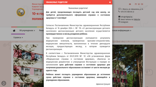 | AI-анализ | The website is for the 10-я городская детская клиническая поликлиника (10th City Children's Clinical Policlinic) in Minsk, Belarus. It is an institution under the Ministry of Healthcare of the Republic of Belarus and is administered by the Minsk City Executive Committee's Healthcare Department. The website provides information on the clinic's services, schedule, and contacts. Keywords related to the website include 'прейскурант' (prices), 'подробнее' (details), '375' (Belarus country code), 'беларусь' (Belarus), 'поликлиники' (policlinic), 'здравоохранения' (healthcare), 'работы' (work), 'диагностике' (diagnostics), |