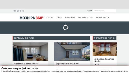 | SEO-описание | Проект «Мозырь 360» предназначен для демонстрации посетителям сайта заведений, достопримечательностей и интересных мест города с помощью панорамных фотографий в формате 360°. Владелец любого заведения города и района может заказать создание виртуального тура и его бессрочное размещение с возможностью его встраивания на официальные сайты, а также интеграцией в социальные сети. |