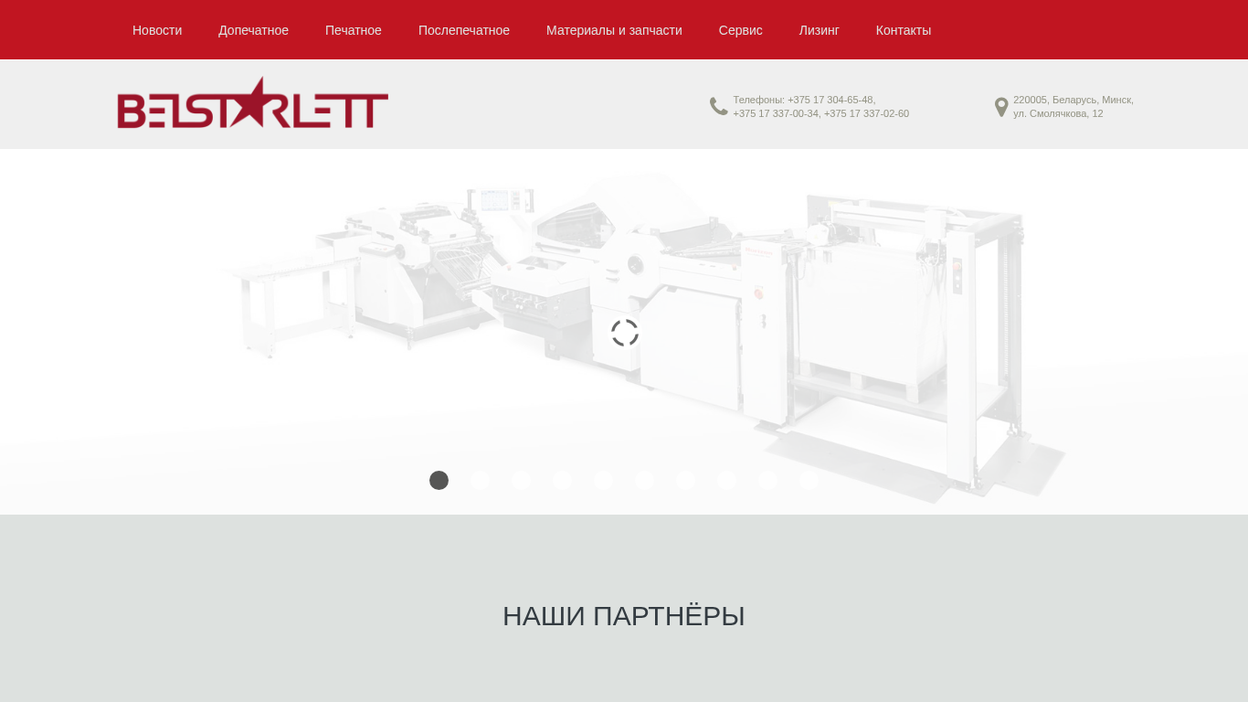 | AI-анализ | The portal OOO BelStarlett is a supplier of equipment for the printing industry based in Belarus, specifically located in Minsk, Belarus, at ul. Sмолячкова, 12, 220005. The website features news, information on pre-press, press, and post-press materials and spare parts, as well as services, leasing, and contact details. Keywords associated with the site include 'Belarus', 'Minsk', and 'printing equipment'. The site can be reached via several phone numbers: +375 17 304-65-48, +375 17 337-00-34, and +375 17 337-02-60. |