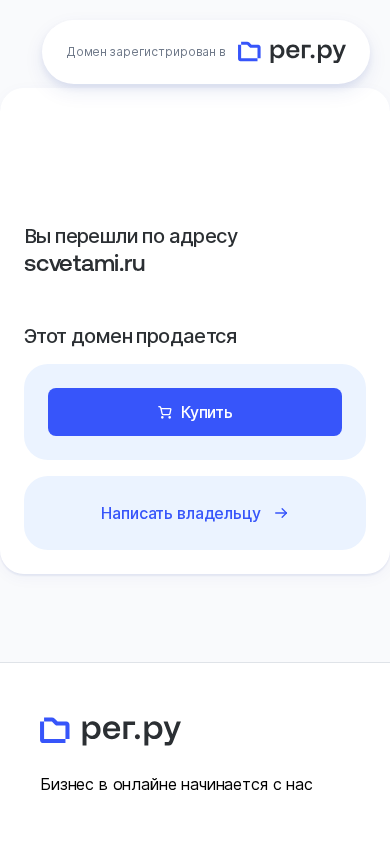 The portal scvetami.ru is a business website for Reg.Ru, an organization offering domain registration, web hosting, and IT infrastructure services. The website states that the domain scvetami.ru is for sale. The visitor has been redirected to this address from scvetami.ru. The services provided by Reg.Ru include domains, hosting, site creation, SSL certificates, VPS hosting, cloud and IT infrastructure, cloud servers, private cloud, cloud storage, Kubernetes-cloud, and database servers. The website also features news about the company and technology.
