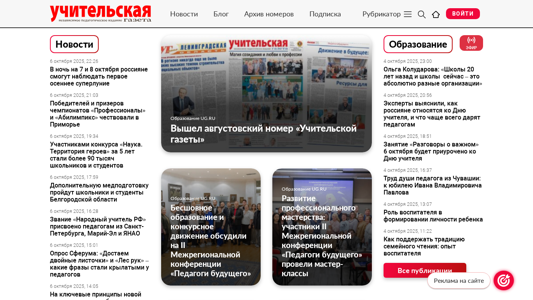 | AI-анализ | language: ru country_code: BY This website, titled "Учительская газета - главные новости образования" (Teacher's Newspaper - Main News of Education), is a Russian-language network publication focusing on education-related news, open lessons from top teachers, innovative teaching methods, social support for teachers, legal consultations, teacher and student competitions, methodological developments, reader letters, current interviews, film, book, and theater reviews, reports from regions, teacher salaries, and much more. Key topics include education, science, culture, law, ecology, tourism, teacher of the year, grammar, finance, health, teacher and the digit, contribution to the future, educational law, problems and solutions, opinion, art walk, change, and sharp topic. The site includes a news section, blog, archives, subscription, rubricator, login |