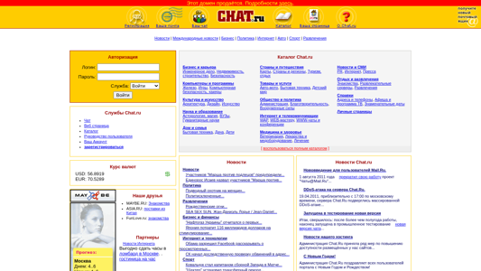 | AI-анализ | This website, titled "Chat.Ru | Добро Пожаловать," is a domain for sale, as indicated by the text "Подробности здесь . " The website offers various categories of news, including international news, business, politics, internet, auto, and sport. Users can log in using a username and password, and there is a chat function, a user account page, and a service page. The website also includes a catalog, user manual, and information about currency exchange rates. Additionally, there are links to partners and friends, such as MAYBE.RU for dating and ASIA.RU for imports from China. The website features news on various topics, including politics, business, and entertainment, as well as advertisements and a marketplace for goods and services. The most frequently occurring keywords are "chat" and "новости," indicating that the website primarily focuses on news and |