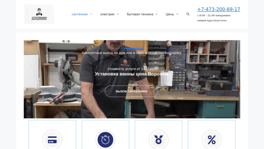 | SEO-описание | Установка ванны в Воронеже . Монтаж под плитку, на ножки и каркас с гарантией на сантехнические работы 1 год. Выезд мастера сантехника на дом от 30 мин |
