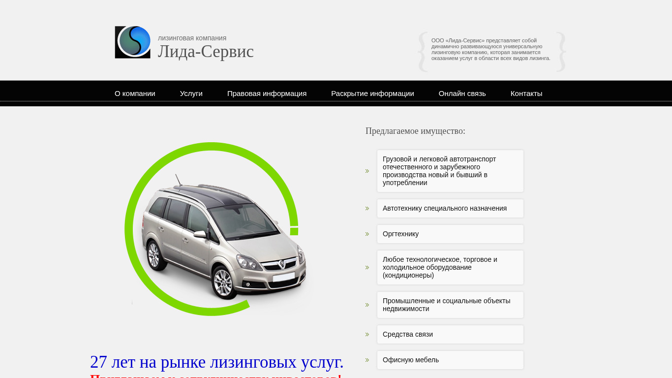| AI-анализ | language: ru The website is a financial leasing company, "Lida-Services" OOO, offering services in all types of leasing on favorable terms. The company, which has been active for 27 years, presents itself as a dynamically growing universal leasing company. It provides services related to cargo and passenger vehicles of domestic and foreign production, both new and used, as well as special equipment, office equipment, industrial and social facilities, communication equipment, and office furniture. The company also welcomes investors to collaborate. The text explains that leasing is a service where a company or individual leases an asset for a specified period in exchange for regular payments. The offered assets include various types of vehicles, equipment, and real estate. The benefits of leasing are highlighted, and the contact information is provided. |