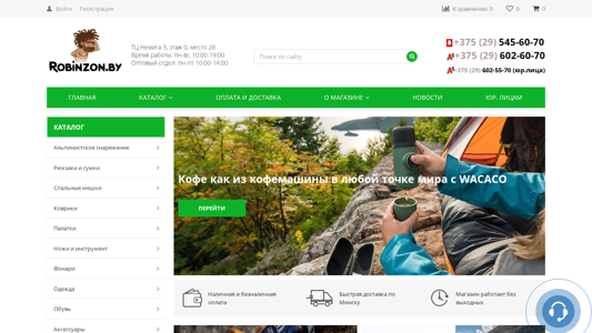 | AI-анализ | --- This online resource is a shopping site for tourist equipment and goods based in Minsk, Belarus. The catalog features high-quality camping gear from Robinzon, including carabiners, ropes, harnesses, backpacks, tents, cups, and more. Delivery is available throughout Belarus. The minimum order value is 0, and users must add items to their cart to reach this amount for checkout. The site lists no currently selected items in the cart, and there are no items on hold. The catalog offers a variety of items, including rucksacks, buffs, accessories, knives, trekking equipment, flashlights, thermoses, and various types of bags and clothing. The site includes a store locator and contact information for an opt-in department. |