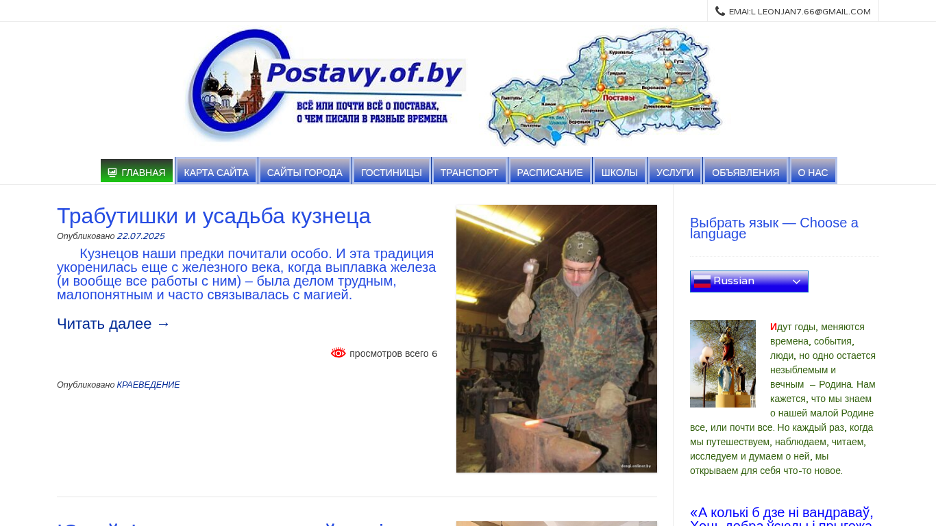 | AI-анализ | --- The web project "Postavy.of.by" is a local history and cultural heritage site dedicated to the city of Postavy in Belarus. The site features publications on various topics related to the city, including articles, exhibitions, and memorials. The main page displays a menu with sections for the city's sites, guest houses, transportation, and services. One of the articles published on the site is about the traditional craft of blacksmithing and the "Trabutki and the blacksmith's estate" exhibition by local designer Yury Furs. Another article covers the Memorial to Fallen Heroes in the Soviet-era Square in Postavy, which includes an obelisk and the graves of Generals Klyar and Harolsky. The site also includes a section on the history of Postavy, covering topics such as the city's revival, its "narrow-gauge life |