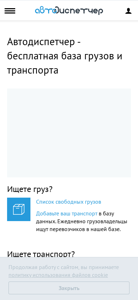 | AI-анализ | language: ru This website is an informational system for cargo transportation in Russia, offering an automated dispatcher service. The main sections include 'free cargos' and 'free transport', featuring search functions for cargo and transport, as well as free placement of ads for cargo and free transport. Additional services include SMS notifications for cargo and transport, distance calculation between cities, a comprehensive catalog of documentation and useful articles, and a calendar of thematic exhibitions. The website offers a personal cabinet for users, including the option to remember passwords and register for free. It is a free database for goods and transport, allowing users to search for cargo if they are looking for it, or add their own transport to the database if they are a carrier. The search function operates using company name, phone number, email, INN, and OGRN. The website also provides distance calculation, confidentiality rules, terms of offer, API services, |