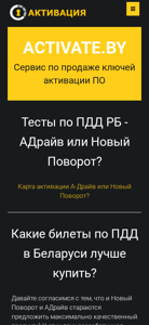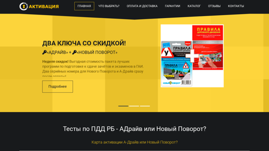 | AI-анализ | The website Activate.by offers online purchases of activation keys for the software programs 'Новый Поворот' and 'А-Дrive'. It provides serial numbers for testing before taking driving exams at the GAI (State Automobile Inspectorate) in Belarus. The homepage features options for selection, payment and delivery, guarantees, a catalog, reviews, and contacts. The site offers two keys with a discount for 'Адрайв' and 'Новый Поворот', as well as a week of discounts. The website provides detailed information on 'АДрайв', 'Новый Поворот 2025', and their features, including various training and control modes, realistic road situation images, and 3D illustrations. Activate.by also offers a service for purchasing activation keys for 'Тесты по ПДД РБ |