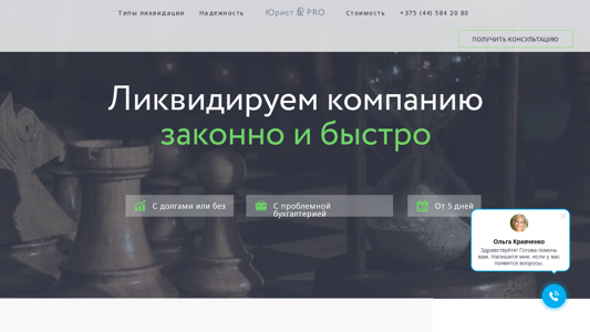 | AI-анализ | The website is a business consultancy firm specializing in legal liquidation of companies in Belarus. The title is "Ликвидация юридического лица" (Liquidation of a Legal Entity) and the description invites visitors to call for information and consultation regarding the process. The keywords suggest that the firm offers legal and efficient liquidation services, with options for voluntary, alternative, and bankruptcy liquidation. The website also mentions a team of lawyers and a commitment to confidentiality. The top words indicate a focus on liquidation procedures, trustworthiness, and affordability. The site includes a contact phone number, an invitation to send a message, and a WhatsApp contact. The text discusses different forms of property ownership, the state of the company's accounting books, and the presence of debts. The website promises to provide a detailed analysis and comfortable conditions for clients. The last |