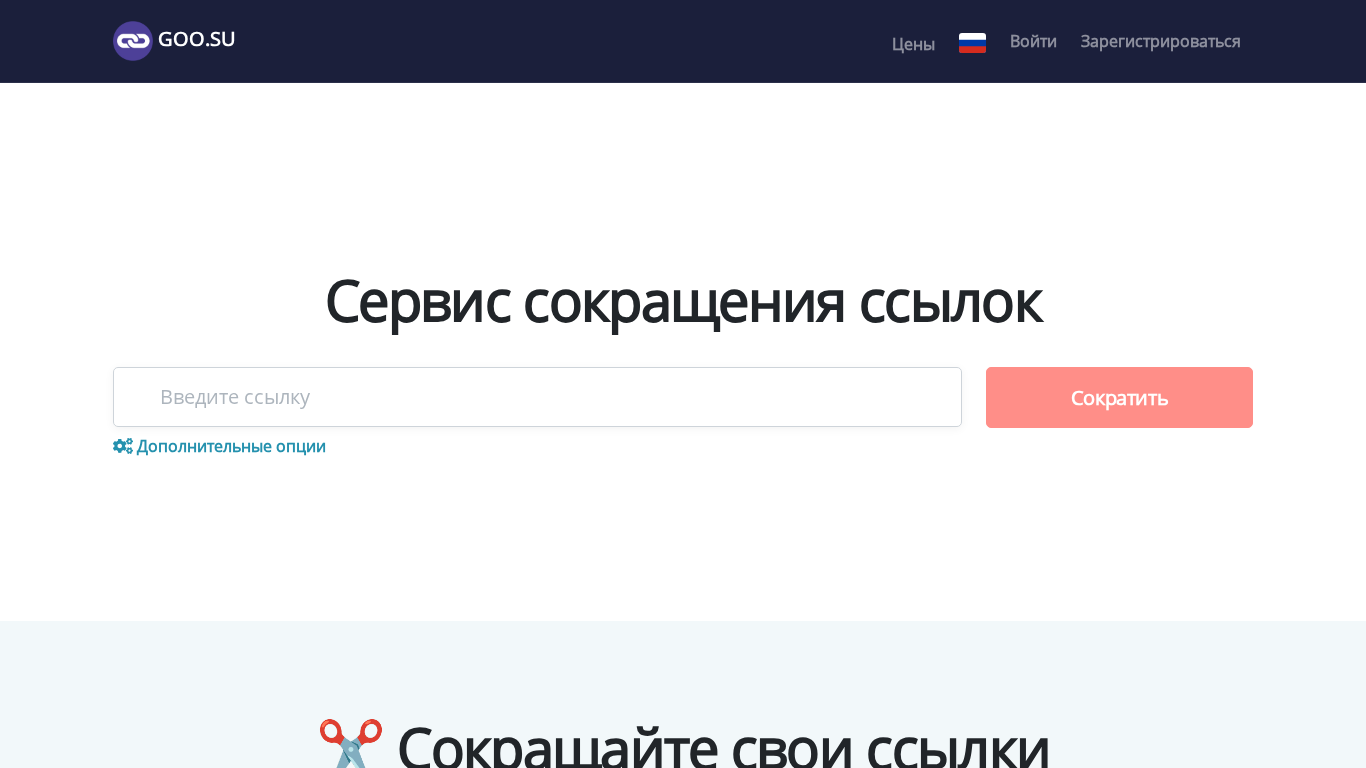 | AI-анализ | language: ru This online resource, titled "Сокращение ссылок - Короткие URL | Goo.su" (URL Shortener - Short Links | Goo.su), offers a free URL shortening service to users. The description text mentions that users can easily shorten long URLs using the service provided by Goo.su. The process of shortening a URL is described as simple, with a 'Сократить' (shorten) button available on the public version of the website. Users can also register for a personal account to access additional features, such as advanced link options, detailed statistics, and easy management of shortened links. The service appears publicly on the website and is indexed by search engines. The website supports multiple languages, including English, Russian, Spanish, Chinese, French, German, Portuguese, Dutch, Japanese, Italian, Korean, Arabic, Polish |