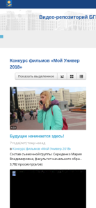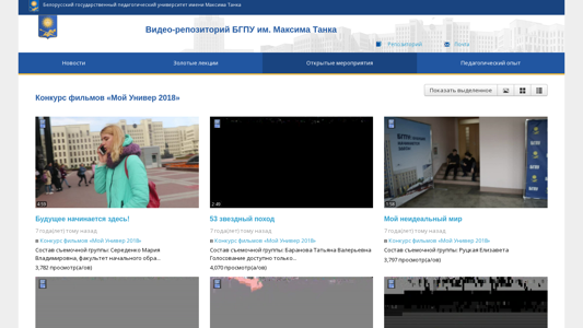 | AI-анализ | The web project "Конкурс фильмов «Мой универ 2018»" (My University 2018 Film Contest) is part of the Belarusian State Pedagogical University named after Maxim Tank's video repository. This website showcases various educational events and films related to the university, including conferences, seminars, webinars, and festivals. The 2018 film contest is a major focus, with information on the composition of the filming group, view counts, and star ratings for several entries such as "Мой неидеальный мир" (My Imperfect World), "Показать выделенное 4:59" (Show Selected 4:59), and "Студент года" (Student of the Year). The contest also includes a voting feature that was only |