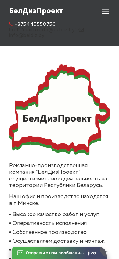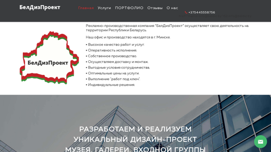 | AI-анализ | This website, titled "3d дизайн, производство рекламы, отделка интерьеров, витрины" (3D design, production of advertising, interior decoration, shop windows) is for BelDizProject, a design-production company based in Minsk, Belarus. The company specializes in 3D design for various types of spaces, as well as the production and installation of all related structures. Additionally, they offer design and production of outdoor advertising and interior decoration. The top keywords include 'изготовление' (manufacturing), 'производство' (production), 'дизайн' (design), and 'оформление' (decoration). The website includes sections for services such as museum design, design for various types of spaces, signage and navigation, and outdoor advertising. Other offerings include furniture production, cityscape design |