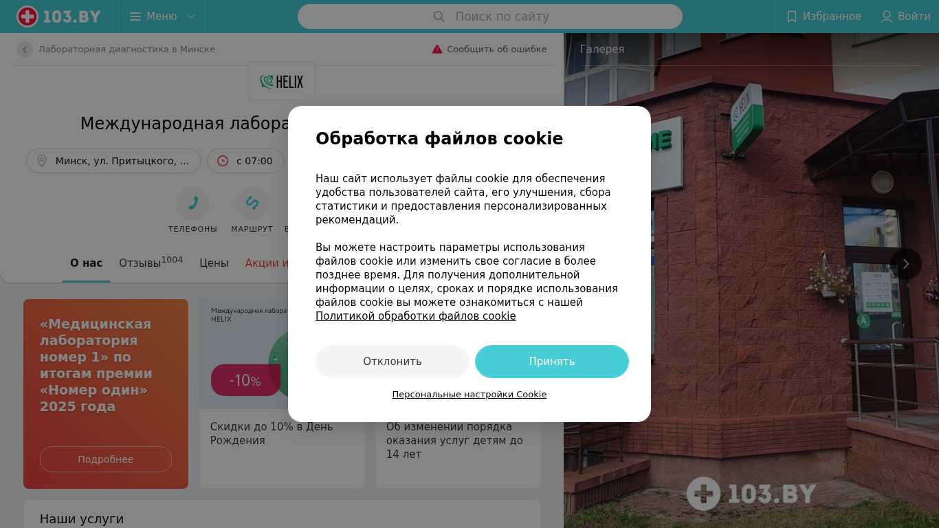 | SEO-описание | Международная лаборатория HELIX (ХЕЛИКС) Минск ул. Притыцкого, 97, Пункт А – телефоны, время работы, отзывы и схема проезда в каталоге медицинского портала 103.by. |