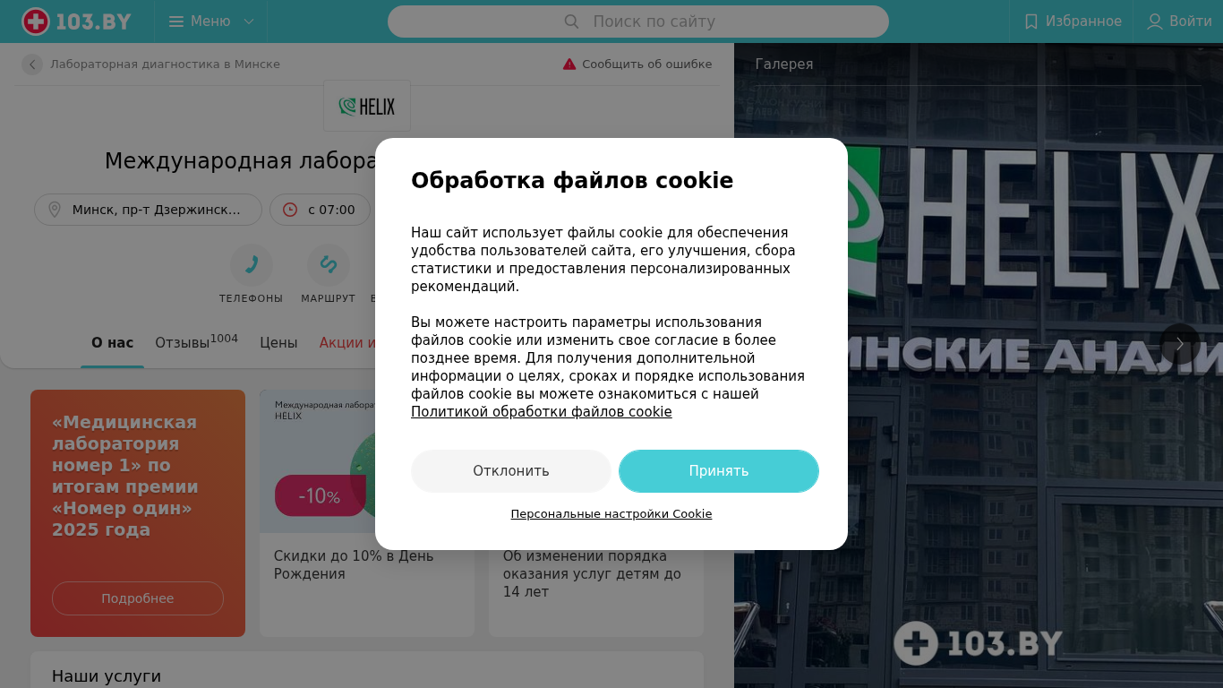| SEO-описание | Международная лаборатория HELIX (ХЕЛИКС) Минск пр-т Дзержинского 19 – телефоны, время работы, отзывы и схема проезда в каталоге медицинского портала 103.by. |