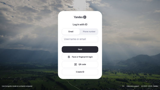 | AI-анализ | This online resource is a login page for an account management system, likely belonging to a digital service or platform provided by Yandex. The title of the page is "Log in," and the description section is blank. The most frequently used keywords on the page include "log in," "with," "email," "phone," "number," "next," "face," "fingerprint," "login," "code," "create," "use," "incognito," "mode," "shared," "computer," "help," "and," "support." Users can log in to their accounts using an email address or a phone number, and they can also opt for alternative login methods such as facial recognition or fingerprint scanning. The page also offers the option to create a new account or use an incognito mode on a shared computer. The footer of the page includes links to help and support, as well as copyright |