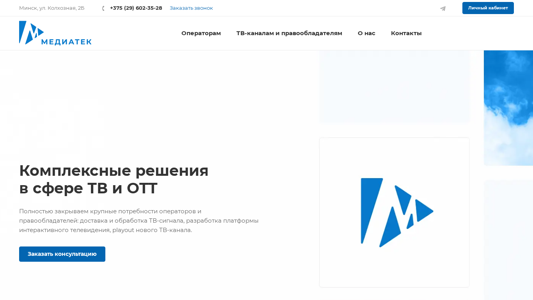 | AI-анализ | --- The web project "Медиатек.by" is a media communications company based in Belarus that offers comprehensive solutions in the TV services sector. The company provides services such as TV signal delivery and encoding, development of OTT platforms, creation of TV channels, CDN integration, and Media API setup for TV channels and content owners. The website offers a personal cabinet for operators, contacts, and a section for ordering services. Services include TV channel delivery, OTT platform development, CDN integration for content, and Media API setup for TV channels and content owners. The company has been in operation since 2010. |