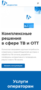 | SEO-описание | Компания Медиатек предлагает комплексные решения в сфере ТВ-услуг: доставка и перекодирования ТВ-сигнала, разработка OTT-платформы, разработка ТВ-каналов, подключение к CDN, настройка Media API |