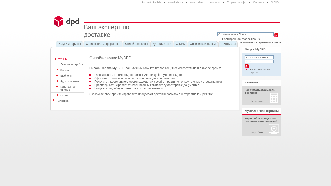 | SEO-лексика | mydpd dpd доставки отправка www контакты услуги тарифы ваш отслеживание заказов калькулятор отправки документов заказы онлайн-сервис время стоимость распечатывать получать |