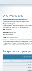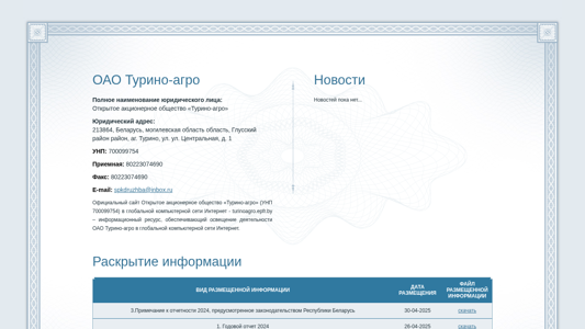 | AI-анализ | The portal 'Turino-agro OAO' (UNP 700099754) is a Belarusian information resource that provides coverage of the activities of Open Joint Stock Company 'Turino-agro' on the global computer network Internet. The website offers downloads of annual reports from 2020 to 2024, as required by Belarusian legislation. Users can access the personal cabinet with an email address and password. Registration is also possible for organizations and individuals. The website's development was carried out by epfr.by. |