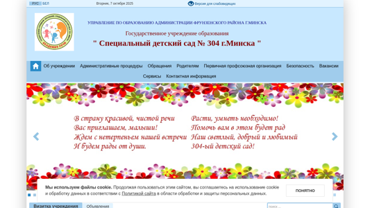 | AI-анализ | The website is the official page of Special Educational Institution "Detskiy Sad No. 304" in Minsk, Belarus, under the administration of the Ministry of Education. The website provides information about the institution, its mission, tasks, and functions as a special kindergarten for children with developmental issues. It outlines the admission process, the correctional educational process, the rules and roles of pedagogical staff, and the history and achievements of the kindergarten. The website includes sections on cooperation with the Institute of Inclusive Education, photo gallery, frequently asked questions, and a policy on handling personal data. It also includes information on administrative procedures, the schedule for citizen and legal entity inquiries, and hotlines for various services. The website is intended for parents and guardians, and contains information on the educational program, daily routine, recommended items for children, and additional educational services. The |