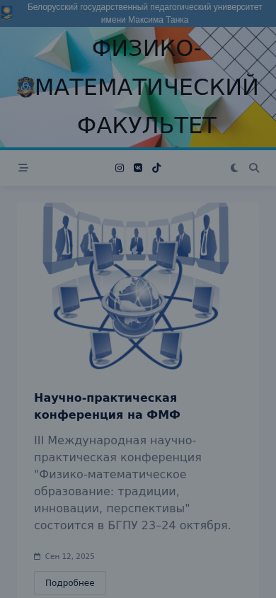 | AI-анализ | This website belongs to the Belarusian State Pedagogical University named after Maxim Tank and hosts the Faculty of Physics and Mathematics (ФИЗИКО-МАТЕМАТИЧЕСКИЙ ФАКУЛЬТЕТ). The title of the website is "ФИЗИКО-МАТЕМАТИЧЕСКИЙ ФАКУЛЬТЕТ ФАКУЛЬТЕТ ДЕКАНАТ О ФАКУЛЬТЕТЕ" in Belarusian and "Физико-математический факультет Факультет деканата по факультету" in Russian. The domain name is fmf.bspu.by. The website features information about the faculty, its departments, news, and various |