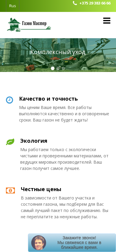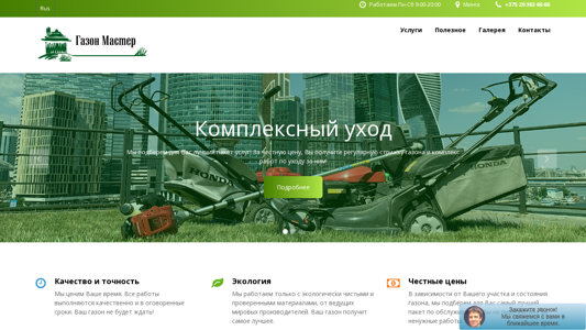 | AI-анализ | The website Gazon Master offers comprehensive lawn care services including mowing, edging, scarification, aeration, fertilization, and weed control in Minsk, Belarus. The website emphasizes the importance of regular lawn care and using eco-friendly materials. The top words suggest a focus on lawns, cutting, and various lawn care tasks such as fertilization, scarification, and weed control. The website also mentions the use of only eco-friendly materials and working with leading global manufacturers. Services include a comprehensive lawn care package, stripping, and various contact and gallery sections. The website operates Monday to Saturday from 9:00 to 20:00 and can be reached at the phone number +375 29 383 66 66. |