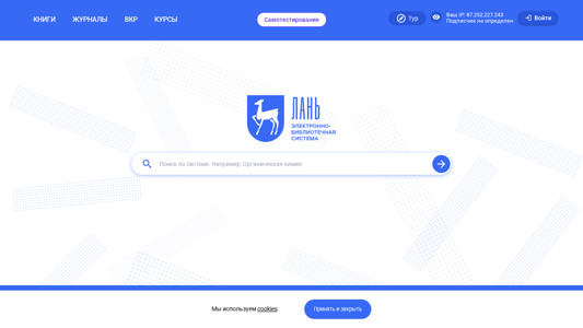 | AI-анализ | The web project "ЭБС Лань" is an electronic library system. Visitors can search for books, journals, and courses using a search function. The system also offers self-testing and visibility enhancement features. It is accessible via IP address 87.252.227.243 and does not require user registration. Some parts of the system may be in test mode and labeled as "тестовый доступ" or "vpn\_key production". The system uses cookies. |