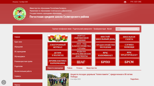 | AI-анализ | The website is for the Pogost Middle School in Soligorsky District, Belarus. It provides information about various educational and organizational events, such as a parent university, safety lessons, museum tours, and youth activities. The website also features news about the school and its partnerships with local organizations and institutions, including a military-patriotic club and a regional festival. The domain is part of the Belarusian education network (edus.by). |