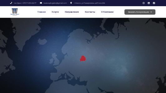 | AI-анализ | The website is for an international cargo transportation company named Trust Way Logistic OOO, based in Belarus. The company offers cargo transportation services between Belarus and countries in Europe, the Baltics, and Kazakhstan. The website states that highly qualified staff is available to help customers transport their cargo in import and export directions to any city and at desired times. The company claims to provide reliable and various international transportation schemes that are more advantageous than those offered by other transport companies. Contact information, including a phone number, email address, and physical location in Minsk, is provided on the site. The site offers services to countries including but not limited to Belarus, Turkey, Russia, China, Lithuania, Kazakhstan, Germany, Belgium, the Netherlands, Italy, Austria, the Czech Republic, and Greece. |