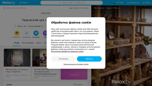 | AI-анализ | The portal Klub masterov Tvorchesky tsekh Minsk – reviews, addresses and phone numbers is a website dedicated to the Club of Masters Art Studio in Minsk, Belarus. It provides information on the reviews, addresses, phone numbers, working hours, and a map for navigation. The website is part of the Relax.by network and focuses on schools of arts in Minsk. The top words on the page include 'school', 'master-class', 'all', 'price', and 'master'. The website offers various master-classes, such as pottery, sculpture, and painting, for individuals and groups, with prices ranging from 55 rubles to 135 rubles per person. The studio is located at Pr. Gazety Pravda 40/1 and can accommodate up to 15 guests. Additionally, there is a second studio located at Ul |