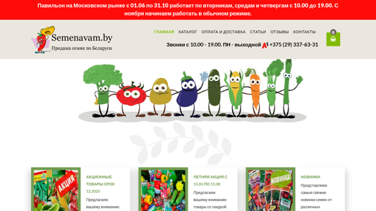| AI-анализ | --- The website <seménavam.by> is an online seed shop focused on selling seeds in Minsk and Belarus. The Pavilion at Moscow Market operates from June 1st to October 31st, working on Tuesdays, Wednesdays, and Thursdays from 10:00 am to 7:00 pm. During November, they work in regular hours. The website offers a wide range of seeds for vegetables, such as tomatoes, corn, sunflowers, and various types of beans, peas, and grains. They also sell seeds for decorative plants, fruits, and herbs, as well as gardening tools and organic fertilizers. The shop also provides information on planting and growing, and offers a catalog of their products. Users can place orders online with delivery and payment information available. The site includes sections for new products, sale items, |