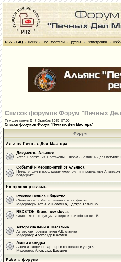 | AI-анализ | --- The website is a forum dedicated to assisting individuals in constructing and finding wood stoves. It also provides information on working with the Guild of Stovemakers and Russian stove builders. The forum includes sections for RSS, FAQ, search, users, groups, registration, favorite topics, profile, login, chat, and a list of forums. The forum's current time is Wednesday, October 7, 2025, 7:00 AM. Some of the forum's topics include the Alliance of Stovemakers, documents, announcements, Russian Wood Heating Society, and various stove-related discussions. The forum also features moderators and user-submitted content. |
