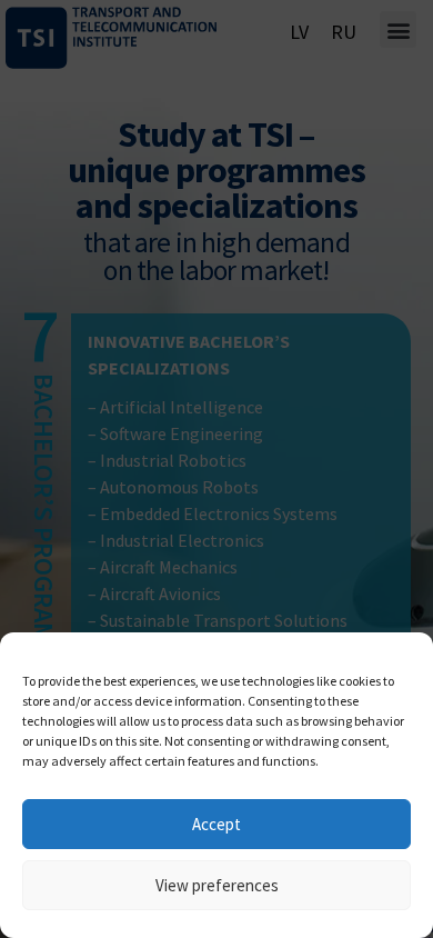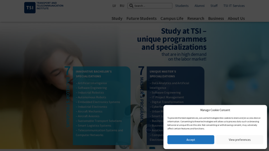 | AI-анализ | This website is for the Transport and Telecommunication Institute (TSI) located in Riga, Latvia. It is the largest non-state technical higher educational and scientific institution in the city. The university was established in 1999 but also includes the core of a technical and aviation school that dates back to 1919. The website provides information about various study programmes such as double degree with UWE Bristol, distance learning courses, executive education courses, summer school, Erasmus+, professional aviation courses, and FAQs for future students. The website also offers information about admission, international scholarships and discounts, and financing options. Additionally, the website includes a section for managing cookie consent and a section for managing services. The domain name for this website is tsi.lv. |