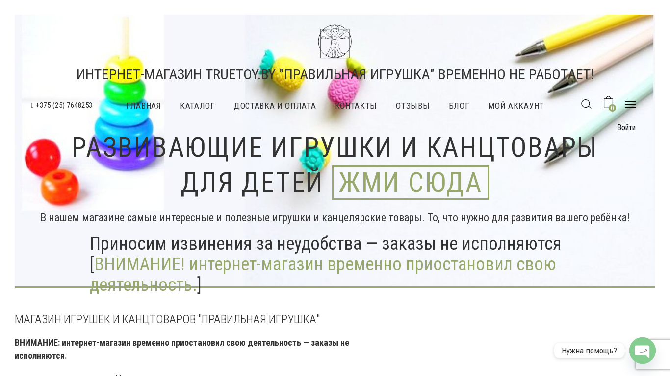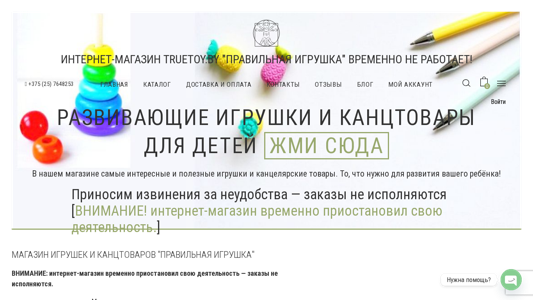 | AI-анализ | --- The website Truetoy.by, titled "Правильная игрушка," is a Belarusian e-commerce store specializing in developing toys and stationery products for children. The offerings include a variety of toys, dolls, puzzles, and educational games, as well as office supplies and gift sets. The store promises prompt shipping within 24 hours of order confirmation and delivery throughout Belarus via postal service in cities or courier within Brest. Payment methods include ERIP, cash on delivery, or card payments to the courier. The website features customer reviews, a blog, and a FAQ section. The store's activity is currently paused, with no order processing. |