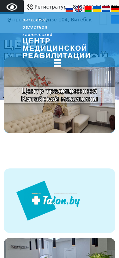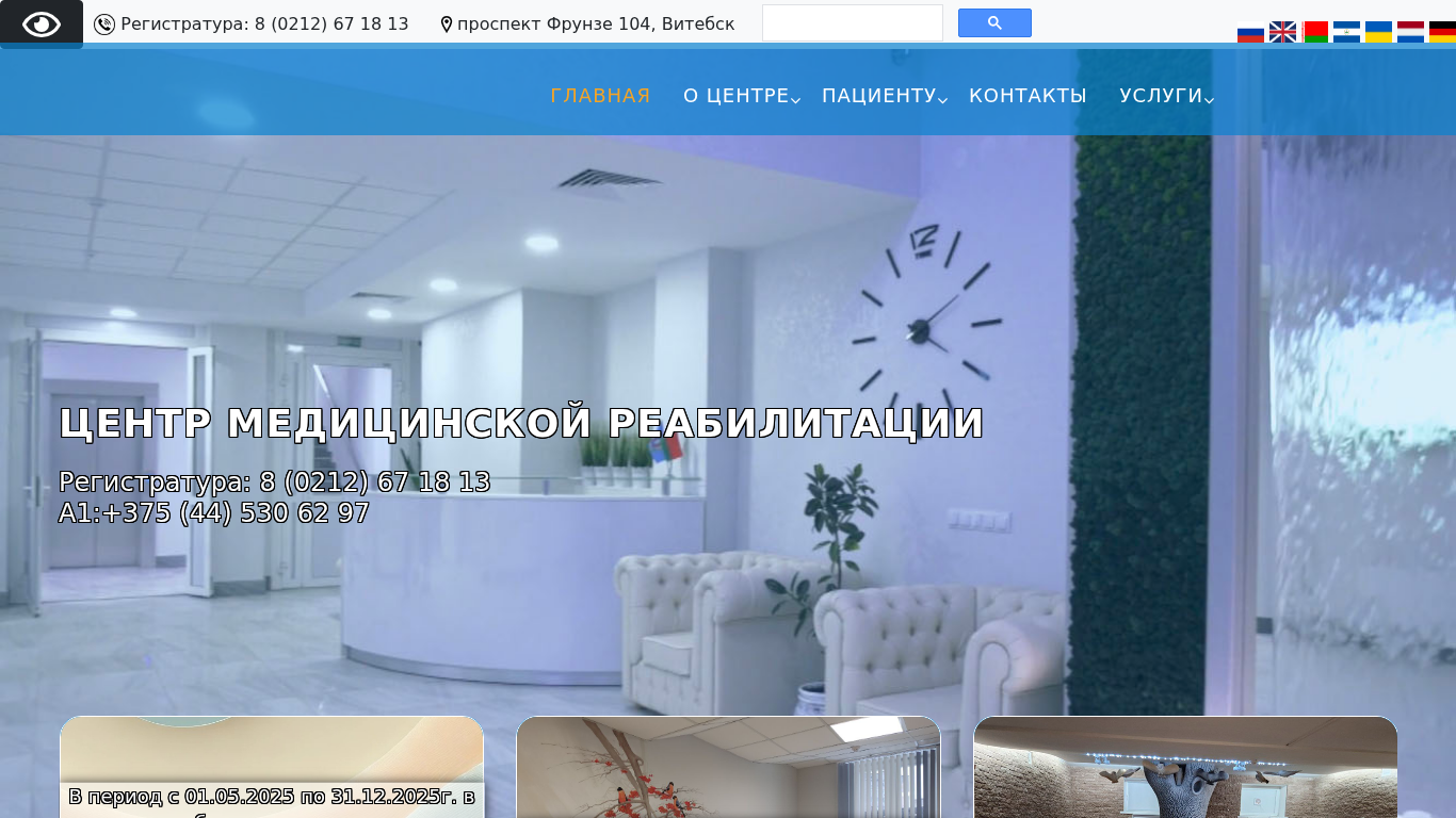 | AI-анализ | This online resource is the official website for the Vitebsk Regional Clinical Center for Medical Rehabilitation for Disabled Persons and War Veterans. The title of the website is "Центр Реабилитации" (Center of Rehabilitation) and it includes information about the center's administration, news, vacancies, anti-corruption work, structure, location, patient information, and various services. The top words on the website include "реабилитации" (rehabilitation), "центра" (center), "центр" (center), "отзыв" (review), "благодарность" (gratitude), "отношение" (relationship), "медицинской" (medical), "порядок" (order), "услуги" (services), and "здоровья" (health). |