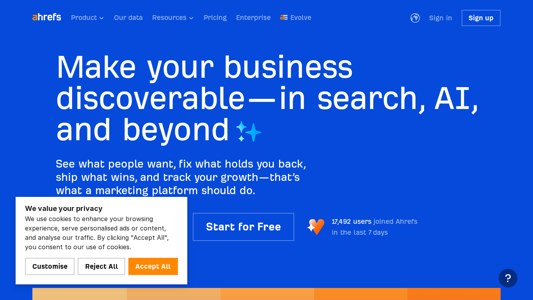 | AI-анализ | language: en country: BY This online resource, titled "Ahrefs," is a marketing platform powered by big data that assists marketers in increasing visibility across various digital channels, including AI search, SEO, content, and social media. The website uses cookies to enhance user experience, personalize ads or content, and analyze traffic. Cookies include those for load balancing, twitter pixel script, Django web development platform, and Google Recaptcha service. The platform values privacy and requires user consent for cookie usage. Essential cookies for site functionality are stored on the browser. |