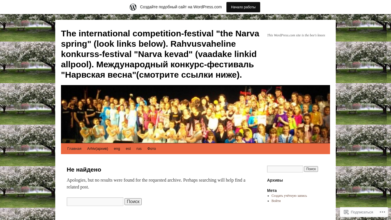 | Название / Заголовок | The international competition-festival "the Narva spring" (look links below). Rahvusvaheline konkurss-festival "Narva kevad" (vaadake linkid allpool). Международный конкурс-фестиваль "Нарвская весна"(смотрите ссылки ниже). | This WordPress.com site is the bee's knees |