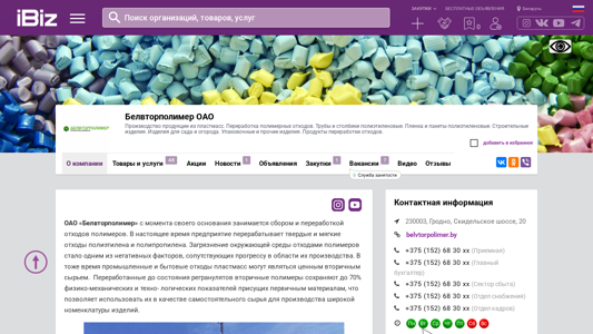 AI-анализ | The portal Belvtorpolimer OAO is a plastics manufacturing and waste polymer reprocessing company. They produce tubes, pipe columns, polyethylene film and packaging, construction materials, items for gardening and agriculture, and various other packaging products. Additionally, they process polymer waste into regranulates, which can be used as raw material for producing a wide range of items. The company has been in operation since its foundation, collecting and reprocessing polymer waste, which has become a significant environmental issue in the production of plastics. However, industrial and household polymer waste can serve as valuable secondary raw materials. The reprocessed polymers, once refined into regranulates, retain up to 70% of the physical and mechanical properties of primary materials, making them suitable for use as standalone raw materials in the production of various goods. Belvtorpolimer OAO |
