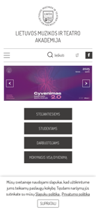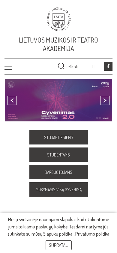 | AI-анализ | The web project LMTA | Pagrindinis is the homepage of the Lithuanian Music and Theatre Academy (LMTA). It provides information about the academy, its structure, and its governance, including its board, senate, and rector. The site also features sections on academy projects, documents, external partnerships, ethics, and various services for students, including bachelor's, master's, and doctoral programs, as well as a student representative body and e-services. There is also a faculty of music, a faculty of theatre and circus, a national film school, and a faculty of fine arts and science. The site mentions a recent international film festival, "Nord Creative Camp 2025," which took place in Kintuose and was organized by the LMTA's national film school, KIMO. The festival involved students and teachers |