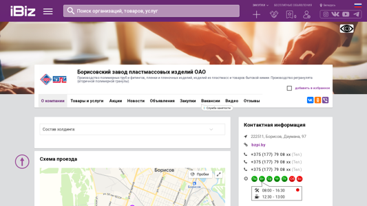 | AI-анализ | The portal is a Belarusian business website for Borisovsky Zavod Plastmassovyh Izdeliy OAO, a manufacturer of polymer tubing and fittings, plastics and plastic products, household chemicals, and secondary polymer granules. The website provides contact information, including phone numbers and an address in Borisov, Belarus. The main product categories include plastic barrels, plastic buckets, packaging, kitchenware, gardening tools, and cleaning supplies. The company is part of a larger holding, including OAO "Medplast," OAO "Belhim," OAO "Barchim," OAO "Belvtorpolimer," OAO "Fanipolsky RMZ," and OAO "Electrum." The website offers free classified listings for buying and selling products and services, as well as job |